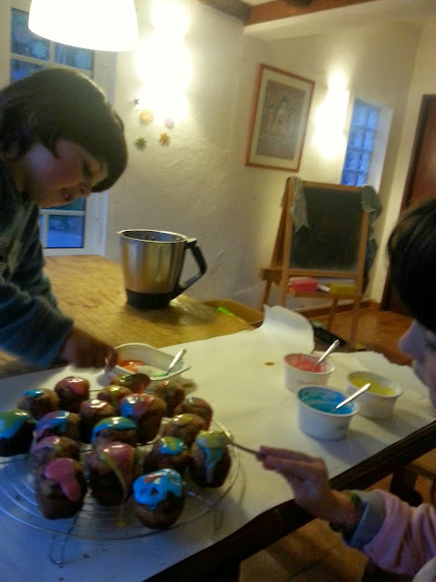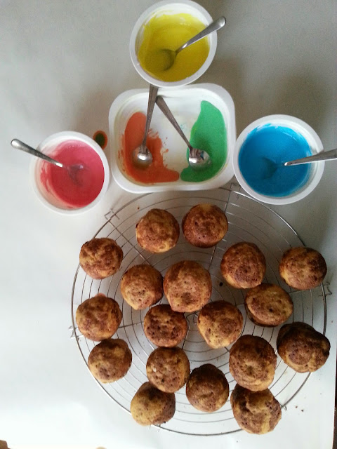 Hoje fizemos uma receita de bolinhos marmorizados e demos por iniciada as comemorações do dia do pai (que será amanhã aqui em Portugal). Para enfeitar, glacê com corante alimentar. As misturas fizeram as delícias da AC e do R. De vez em quando fazemos essa brincadeira, que rende muita bagunça e diversão.