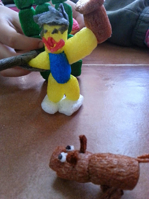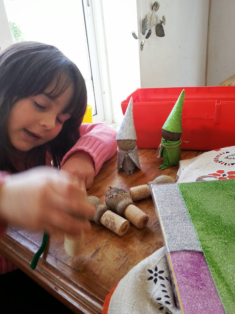 A vontade de fazer algo como aqueles duendes cresceu mas nem sempre há todos os materiais disponíveis... assim decidimos adaptar. Utilizamos as sementes, rolhas de cortiça (tenho um saquinho delas para fazer carimbos com as crianças) e espuma eva. Fizemos sem moldes mesmo porque cada semente com a rolha possui um tamanho diferente.