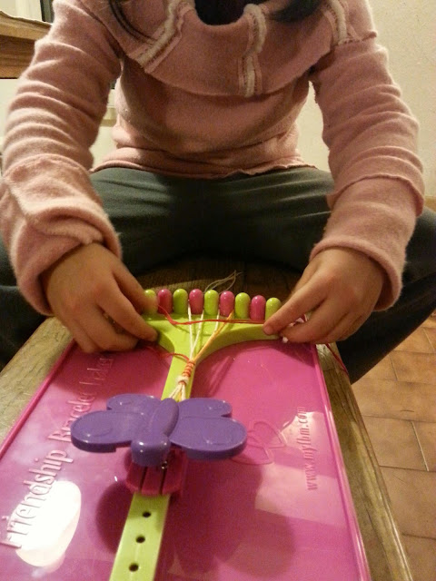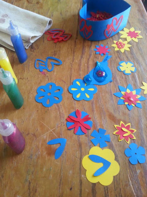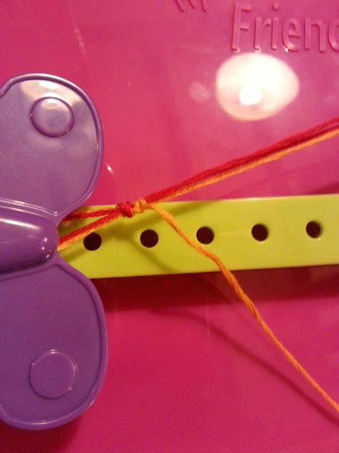 Hoje usamos um cartão e furamos com furador de papel. Um pouco de lã e uma agulha grande na mão de uma menina cheia de vontade de experimentar deu no resultado da foto.